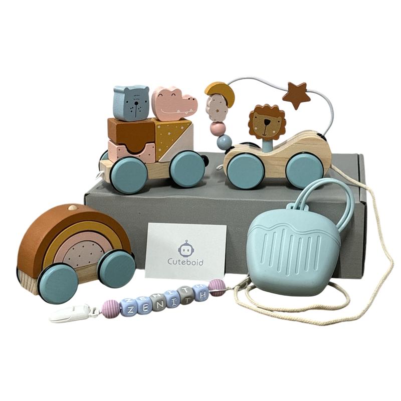 A charming blend of functionality and fun for little adventurers! This set includes a customizable pacifier strap with the baby’s name, a durable silicone pacifier strap holder, and also adorable 3-piece wooden stacking train. The train can be pushed around for endless play, stimulating creativity and motor skills.