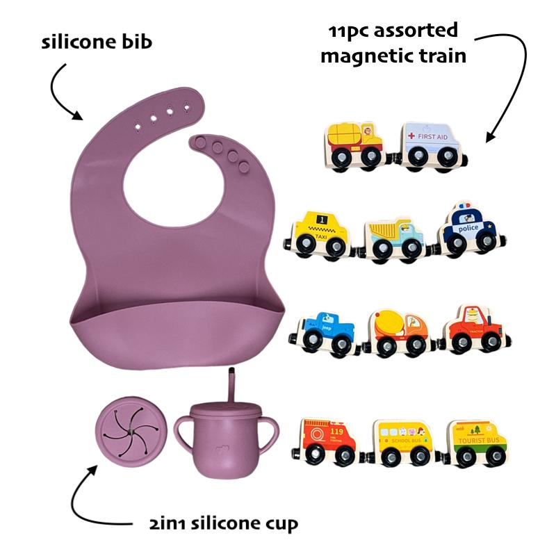 This adorable set includes a soft, easy-to-clean silicone bib for mess-free mealtimes, a versatile 2-in-1 silicone cup designed for little hands, and an 11-piece magnetic wooden train toy to spark imagination and creativity