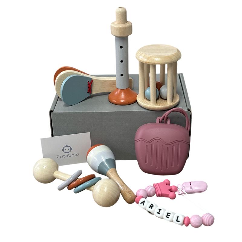 Delightful mix of playful sounds and personalized care for little ones! This set includes a custom pacifier name strap, a silicone pacifier holder for convenient storage, and five charming wooden musical toys, to introduce babies to the joy of sound and rhythm. Ideal for baby showers and first milestones, this gift set brings musical exploration to playtime while offering a personal touch for practical needs.
